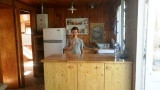 Ein Stromanschluss ist kürzlich gelegt worden, es stehen mehrere Steckdosen mit 220V zur Verfügung, der Kühlschrank läuft ebenfalls auf 220V. Gekocht und geduscht wird nach wie vor mit Gas.