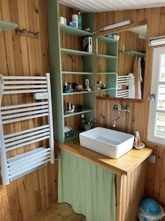Unser Bungalow ist elektrifiziert und hat reichlich Steckdosen, das Warmwasser läuft über eine Gastherme.