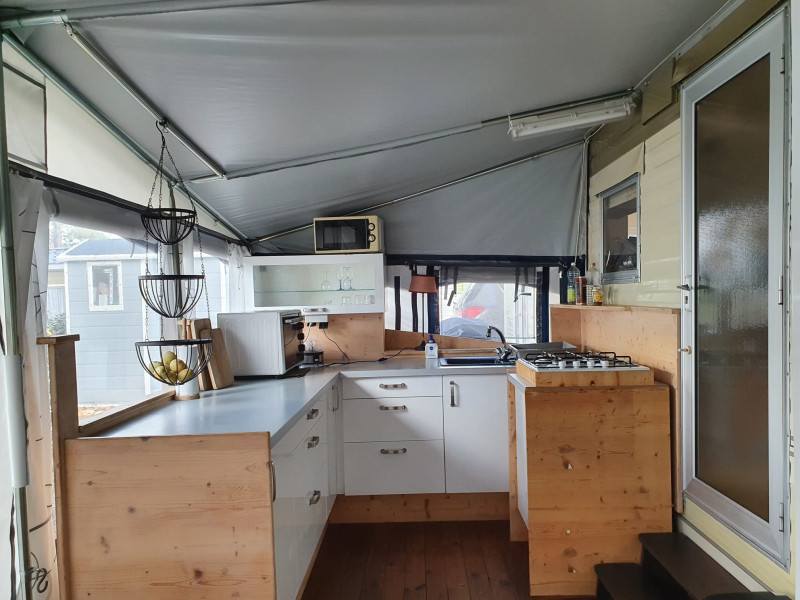 - Eine große, gut ausgestattete Küche mit Warmwasser mit Kühlgefrierkombination, Backofen und Waschmaschine befinden sich im neuen großen Vorzelt.