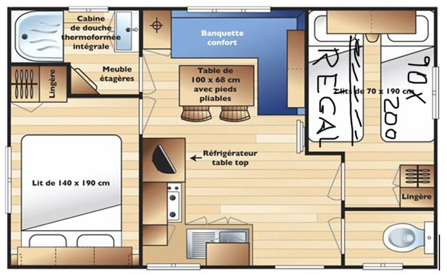 Das eigentlich für 4 Personen ausgelegte Mobilheim bietet von uns optimiert, den größten Komfort für 2 - maximal 3 Personen. Es verfügt über einen modernen, offenen Wohn/Essbereich, komplett eingerichteter Einbauküche, 2 Schlafzimmer (1Doppelbett ,1Einzelbett ) Badezimmer mit Dusche und seperatem WC.