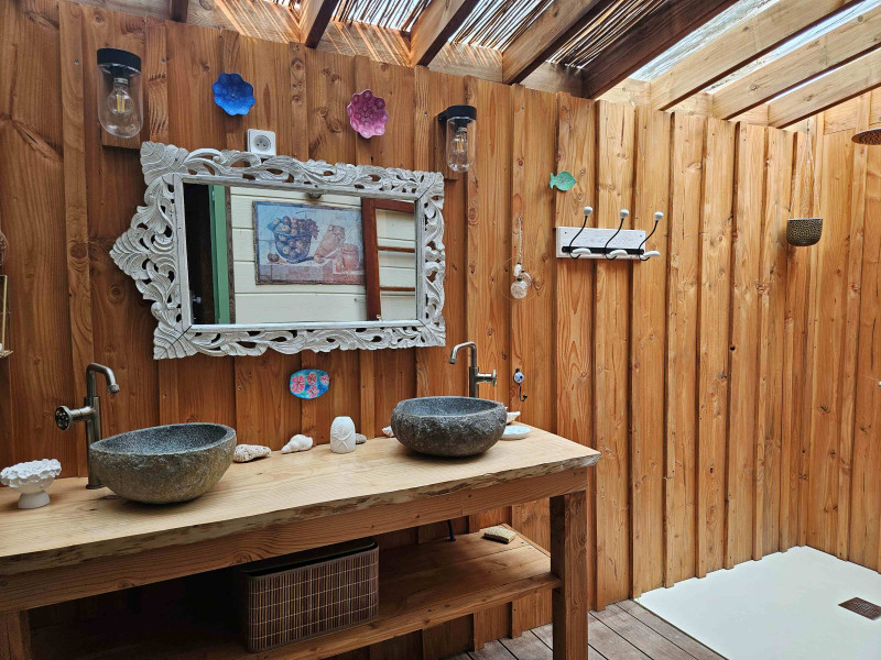 - Cuisine d'été sous auvent : Grand bar, 4 tabourets de bar, micro-ondes, machine à café, grille-pain, réfrigérateur, machine à café Senseo, plancha gaz